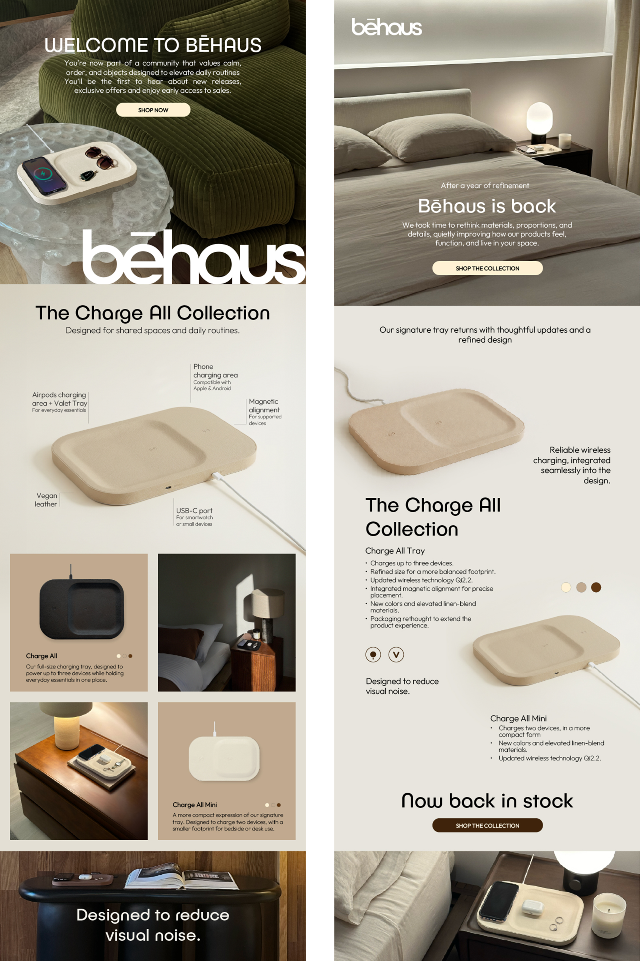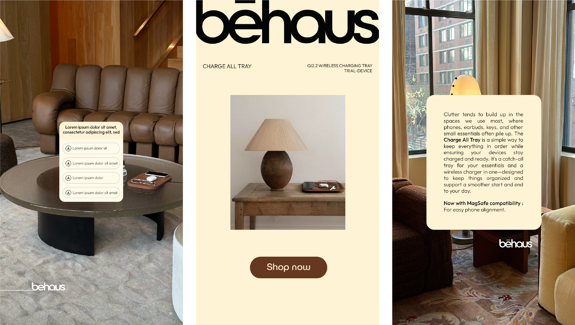 Inspired by the word Behausen, to inhabit, Bēhaus is built around the belief that objects should not exist as isolated solutions, but as integrated elements of a lived environment. The brand shifts away from traditional “home tech” positioning and instead frames its products as: