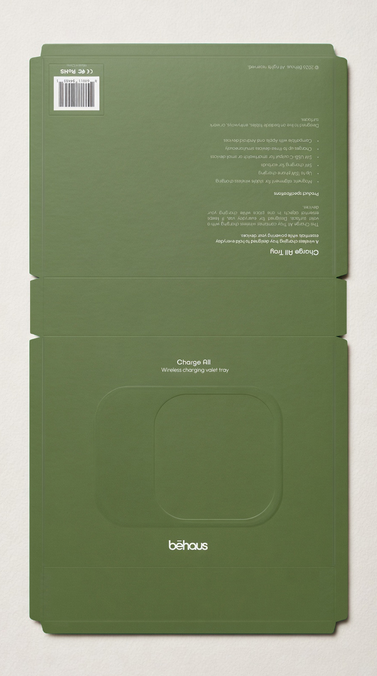 The flagship Charge All Tray combines wireless charging with a valet surface, designed to keep essential items in one place while integrating seamlessly into nightstands and shared spaces. Rather than emphasizing speed or technical features, the product is positioned as: