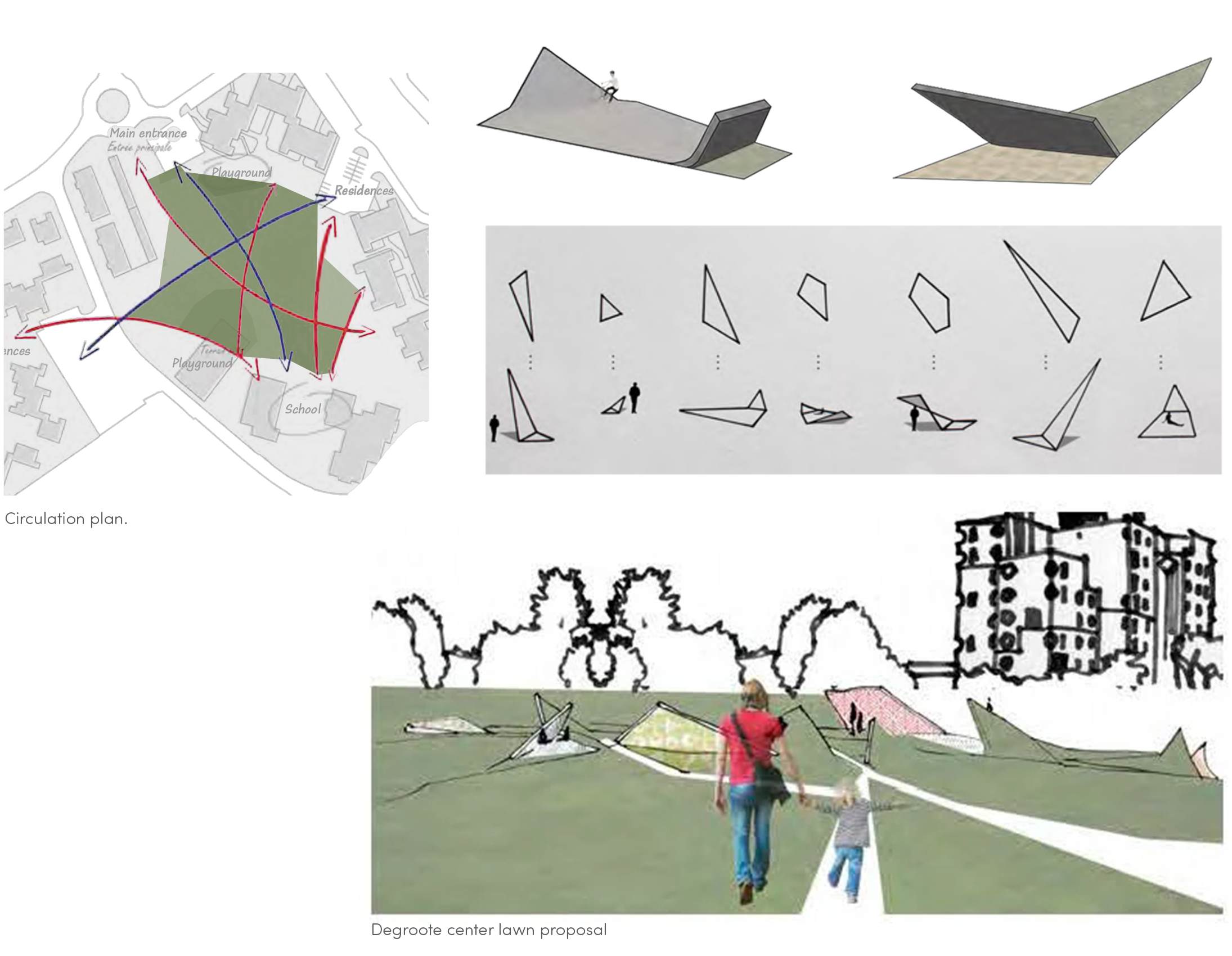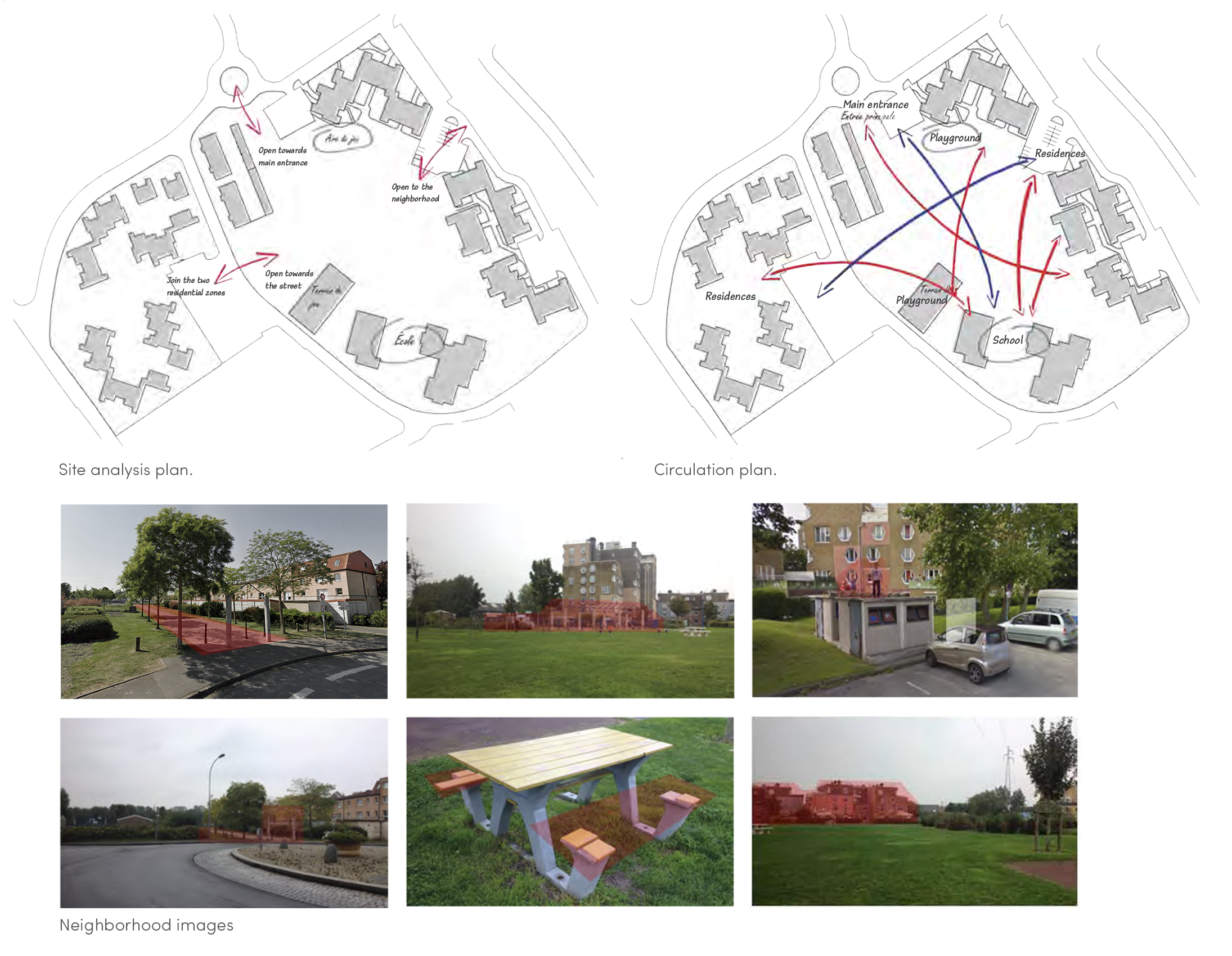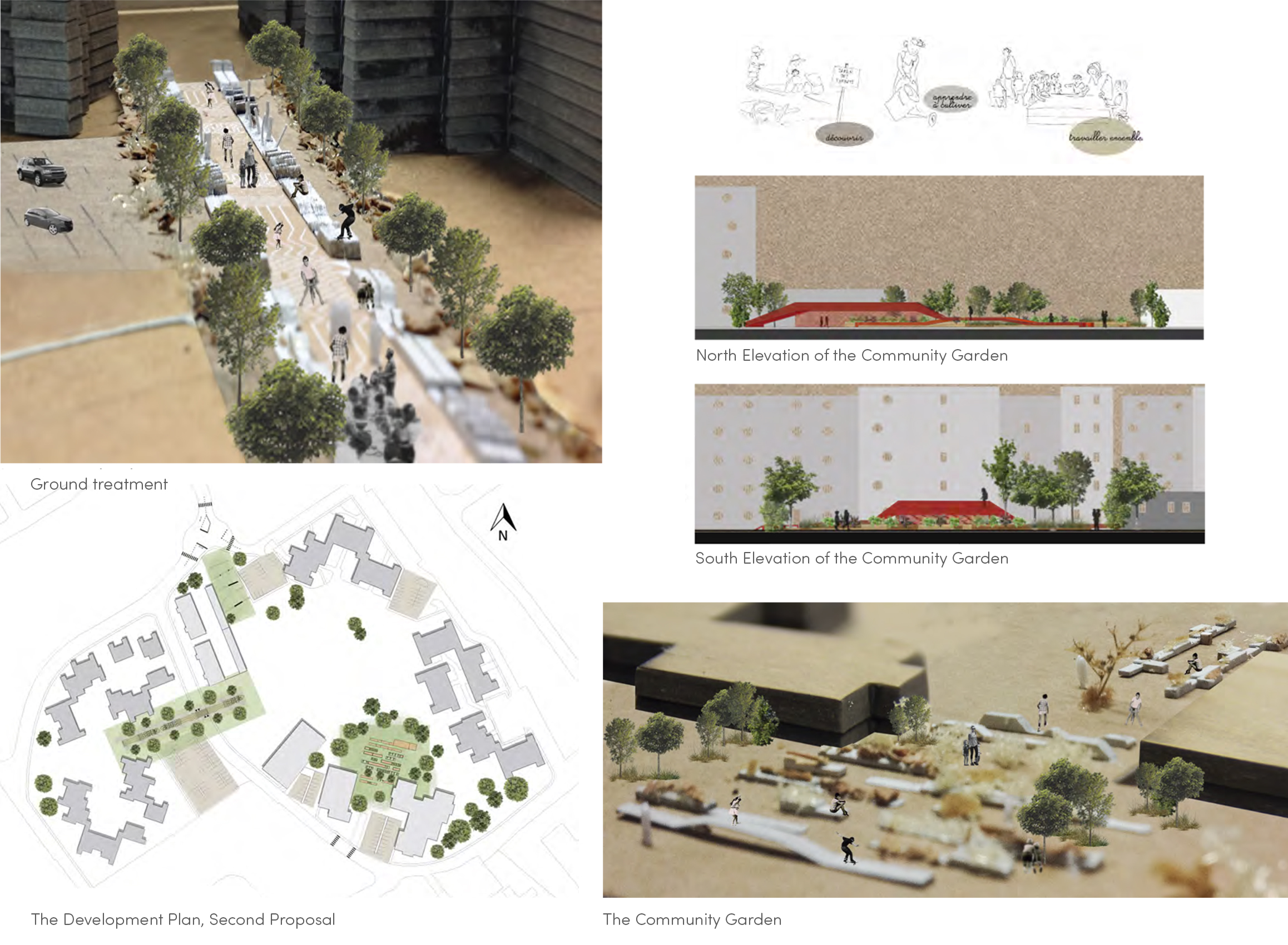 As this site is undergoing development for social housing, including a community center, a school, and a large green space, it was essential to design a project that addresses the needs of children while also generating a positive economic impact for the community. This transformation has the potential to offer a long-term solution to issues of insecurity and the lack of community ownership of the space.To meet the expectations of the city of Dunkirk, several proposals were developed. The first involves transforming the green space by dividing the ground into several segments based on primary and secondary circulation paths. Some of these segments would be elevated at their ends, creating usable space underneath for features such as a play area, sandbox, or community garden.