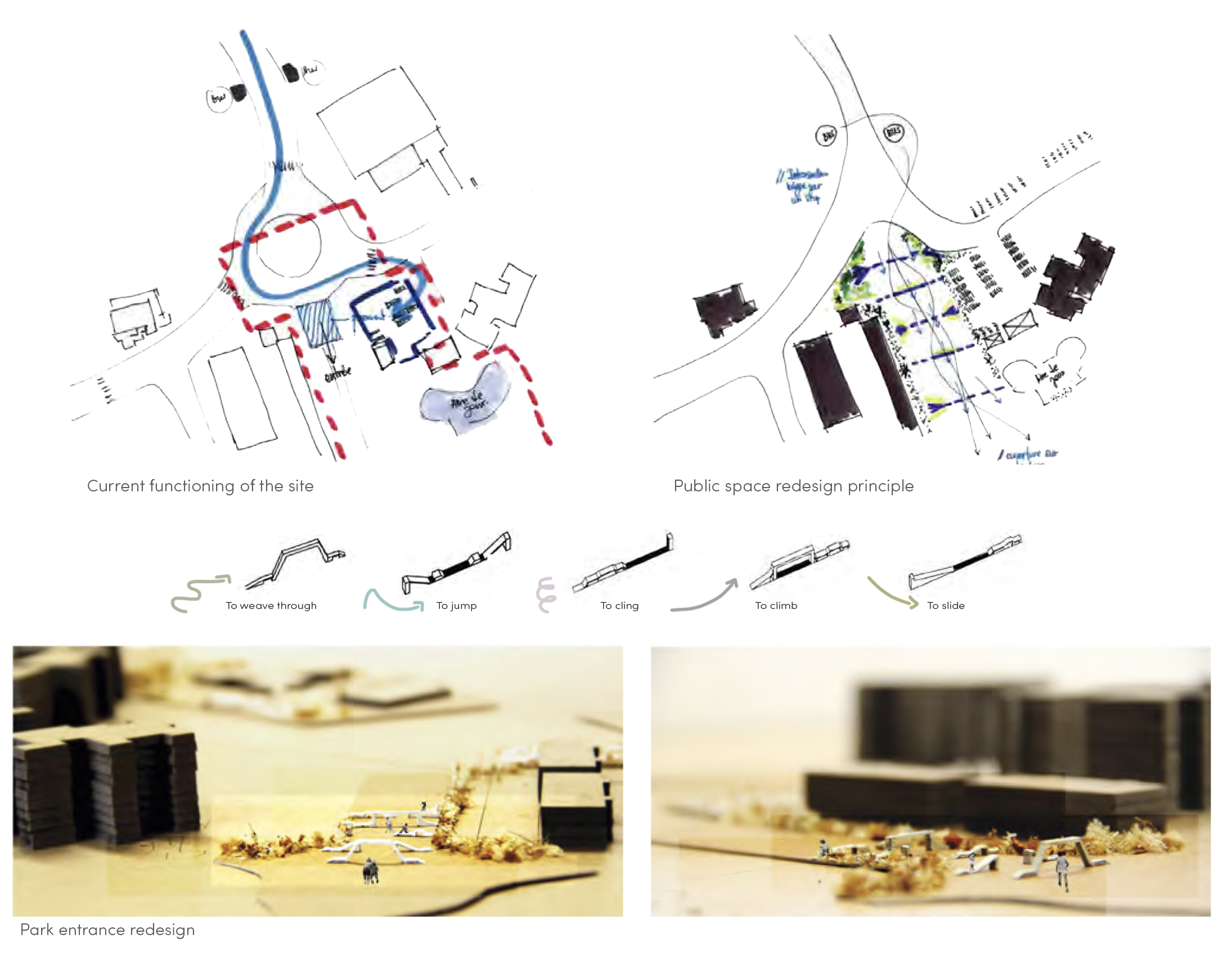 To offer a broad view from the canal, the park entrance is widened, creating space for multifunctional structures. First, they act as visual frames, guiding the eye toward the canal. Second, they serve as play elements. Their shapes influence movement while also inviting playful interaction and use.