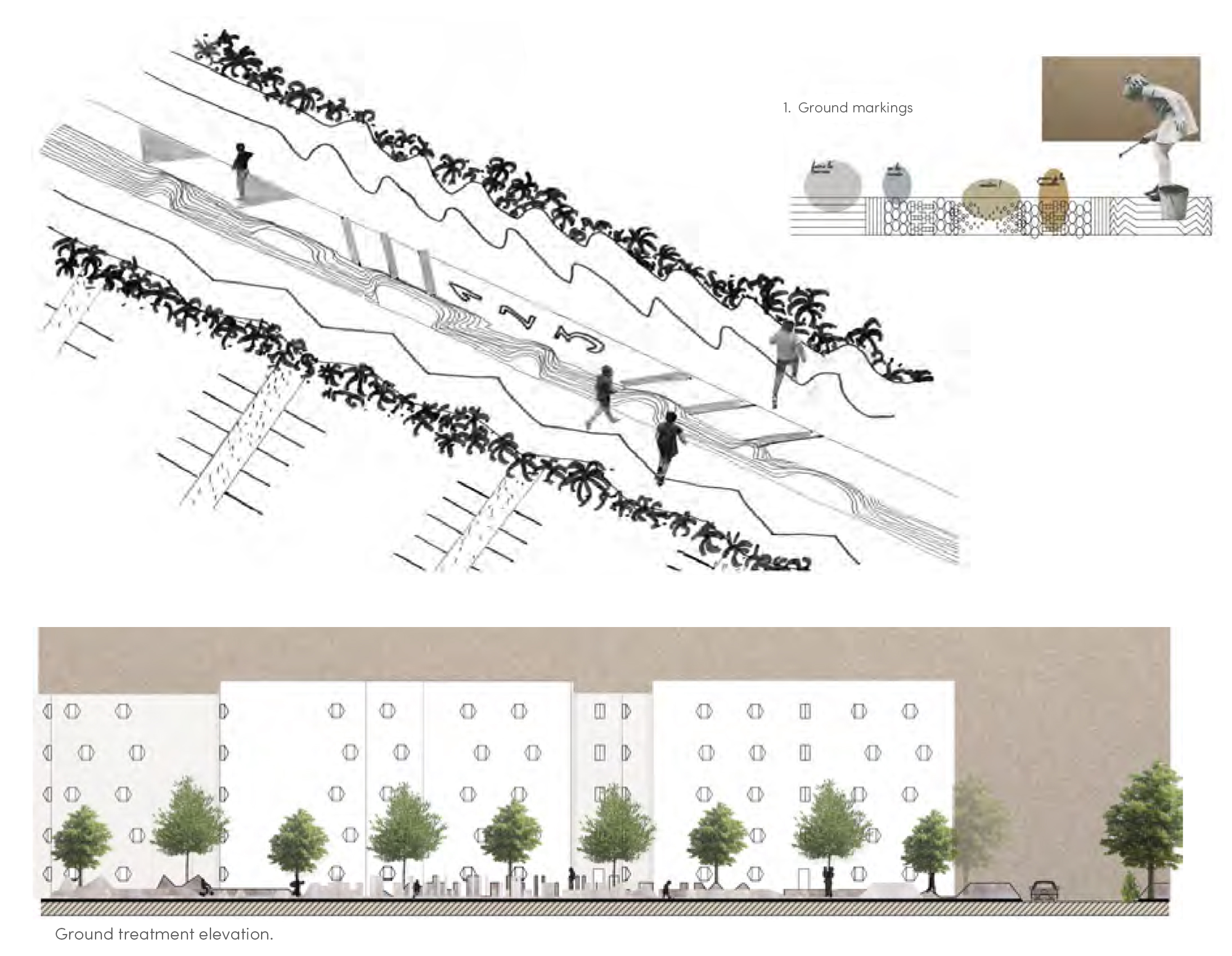 This second intervention aims to create a connection between residential areas currently divided by the road and the parking lot. A wide pathway, featuring a painted grid on the ground, encourages various forms of playful use. On either side, the grid is reinforced by three-dimensional installations.