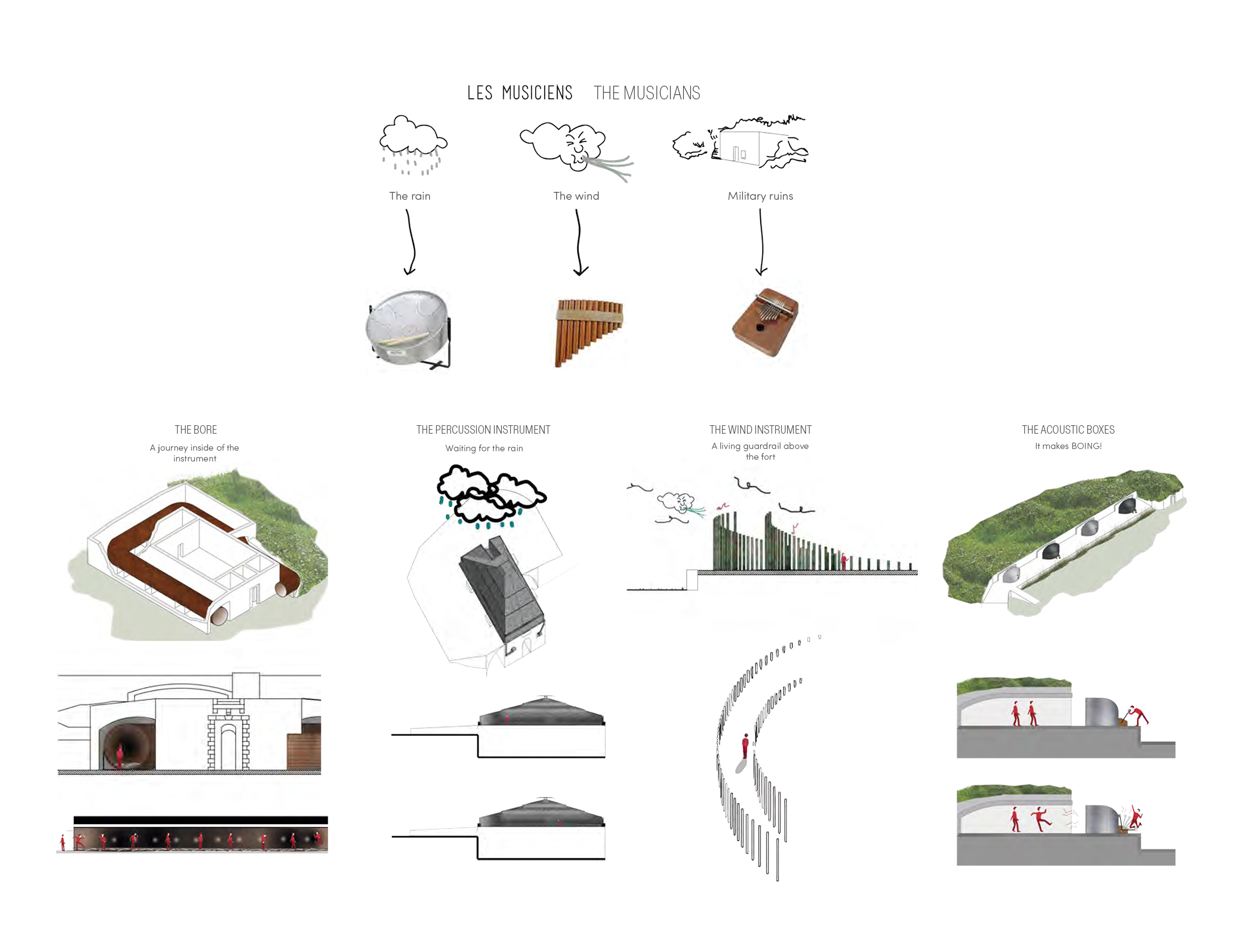 The design approach focused on generating forms that emerge directly from the site: in situ interventions that preserve the raw and untamed character of this historically charged landscape. Rather than imposing an autonomous object, the proposal introduces a musical journey that activates the existing fort structures through the island’s elemental forces, reanimating the different building ensembles and creating the sensation of moving inside an instrument.